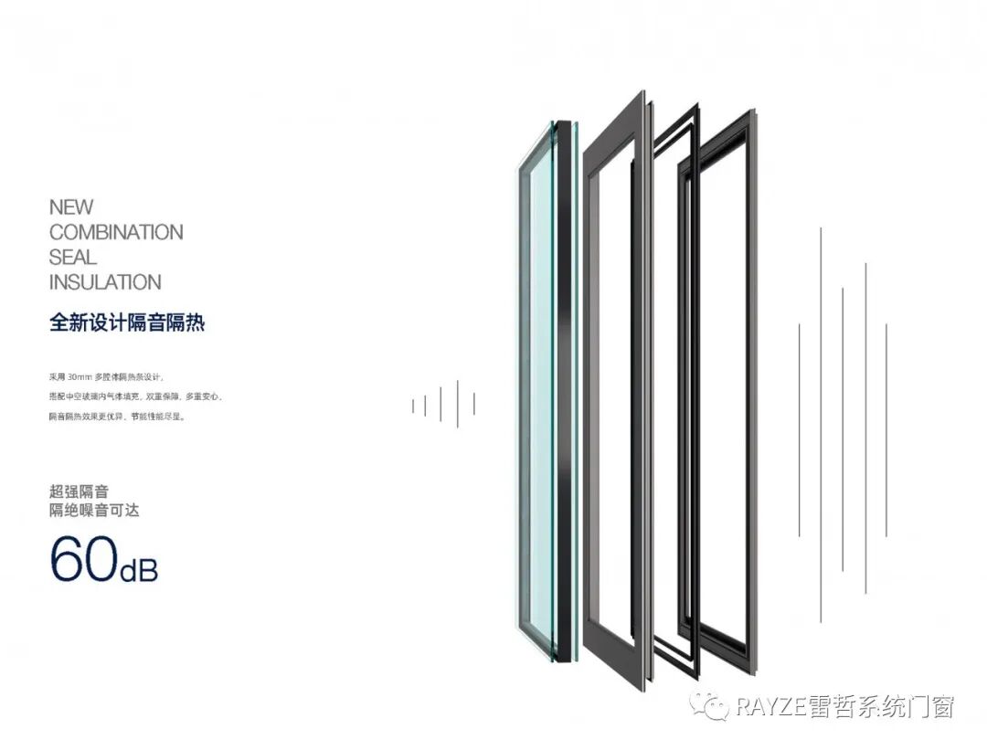 雷哲系统门窗采用5+20A+5钢化中空玻璃,高强度承受力更耐撞击、耐划痕。外侧采用独有的密封结构,安装方便且防风雨性能佳,在创造更高安全、耐用性的同时,也进一步把产品的隔热保温性能提升到了一个全新的层次。