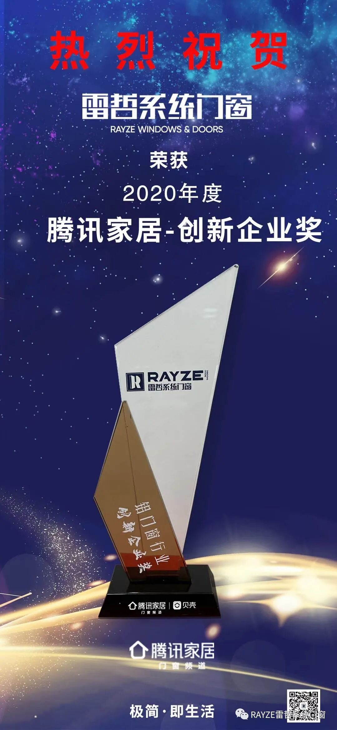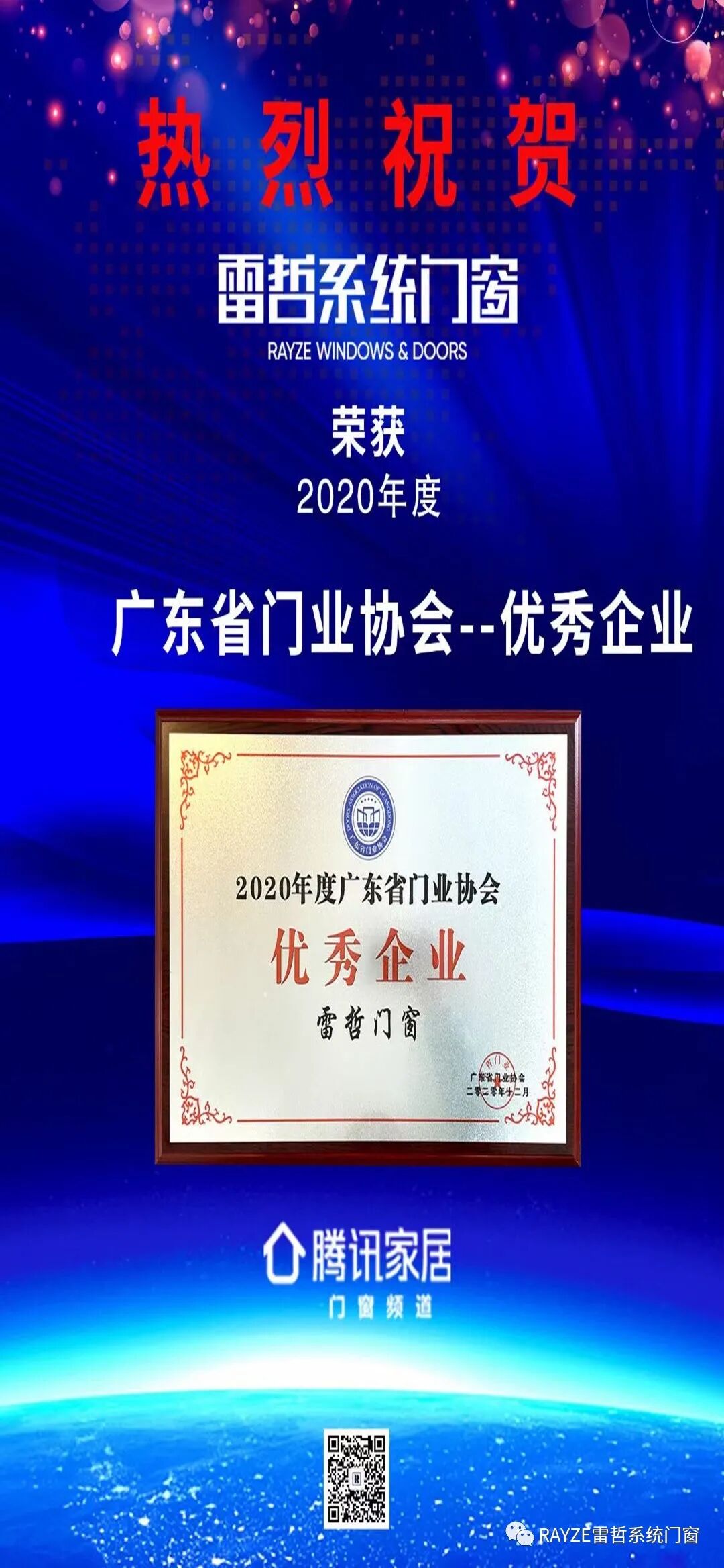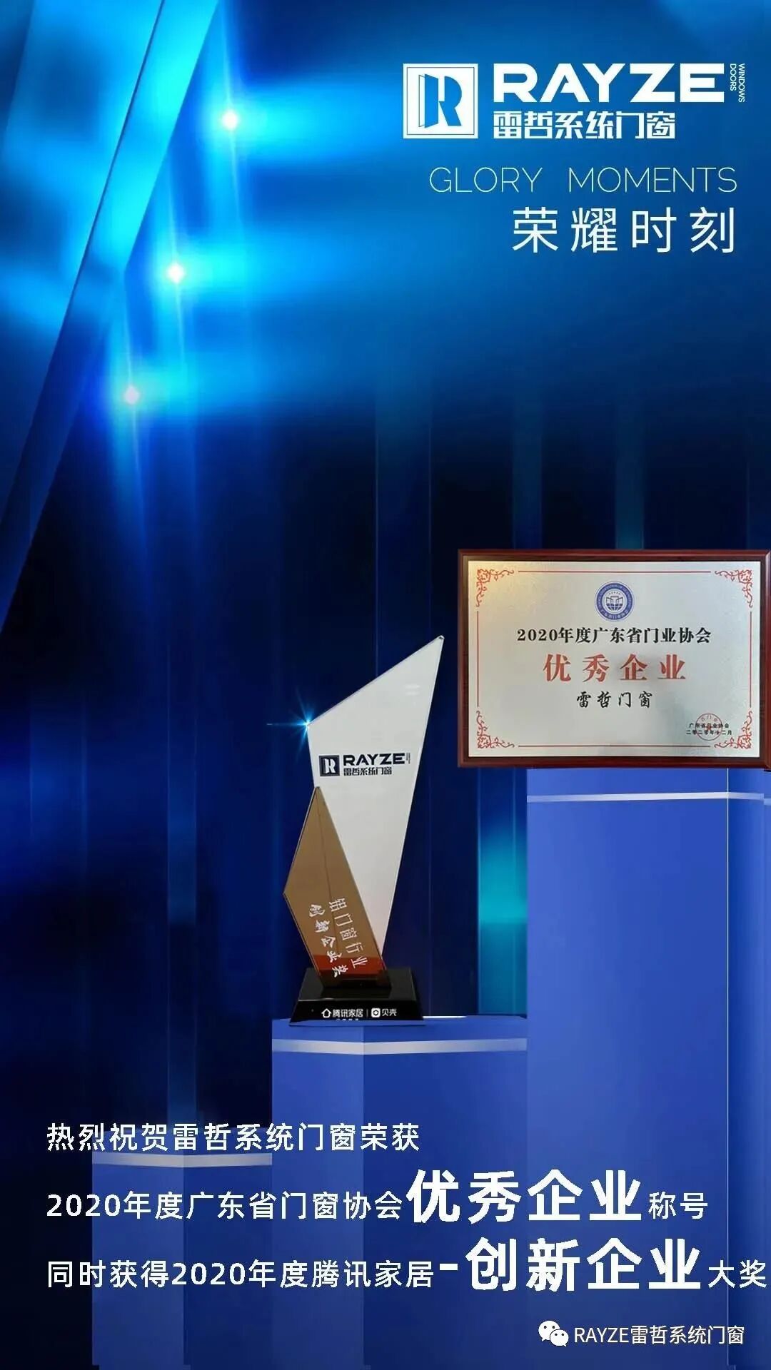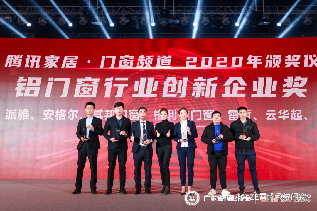 雷哲系统门窗在“凝心聚力 勇毅前行---2020广东省门业协会年会暨行业高峰论坛”上荣获2020年度广东省门窗协会“优秀企业”称号同时获得2020年度腾讯家居“创新企业大奖”。成为了行业万众瞩目的明星新品牌,再一次彰显雷哲系统门窗强大的品牌实力!这是对雷哲系统门窗实力的肯定,同时也见证了雷哲系统门窗在行业公认的品牌影响力。